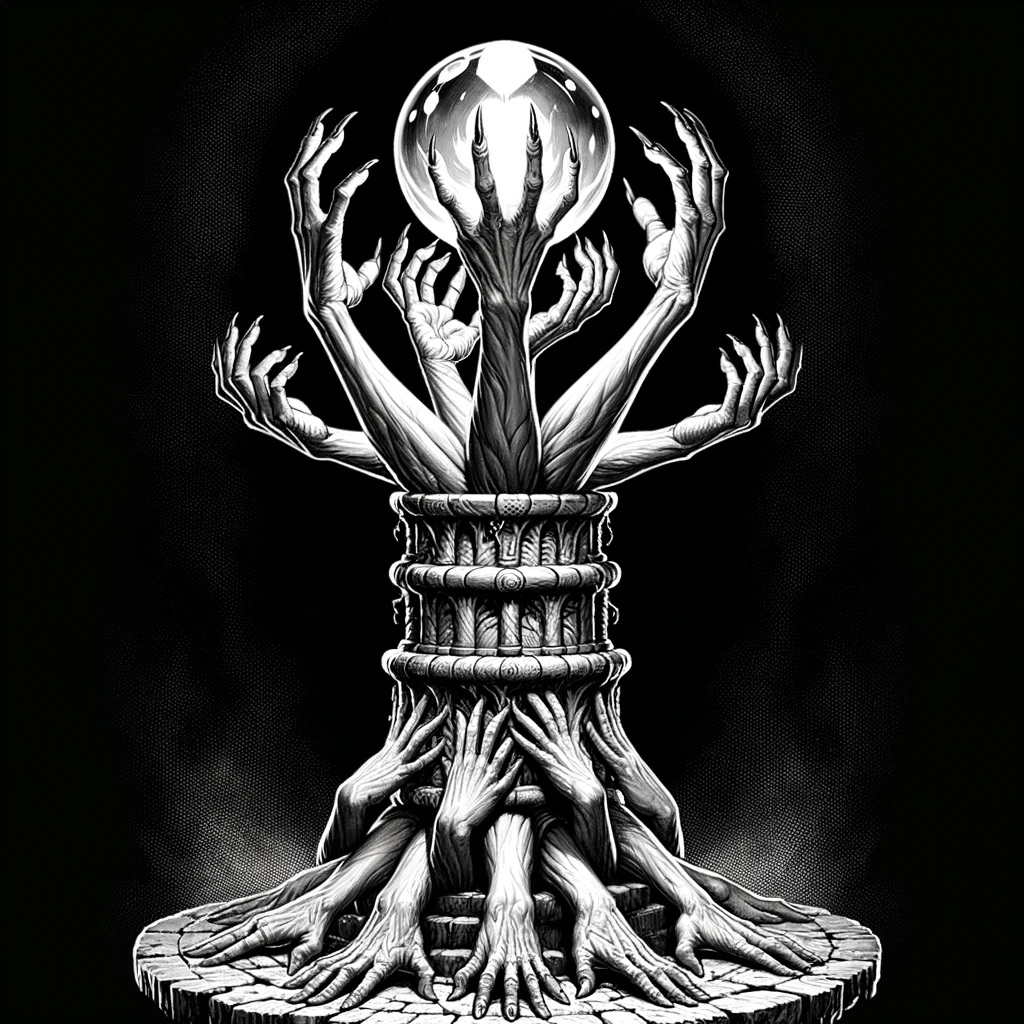 Venturing deeper into the necromancer’s quarters, the adventurers are met with a chilling sight. A sigil of the Elder Elemental Eye dominates the room, propped upon a pedestal of horror – four severed arms clutching one another in a macabre support for a glowing crystal sphere. Above this dark orb, a sinister sigil floats, casting an ominous glow that seems to pulse with malevolent energy. The walls, adorned with dark purple tapestries, seem to whisper secrets of the dark arts practiced within.