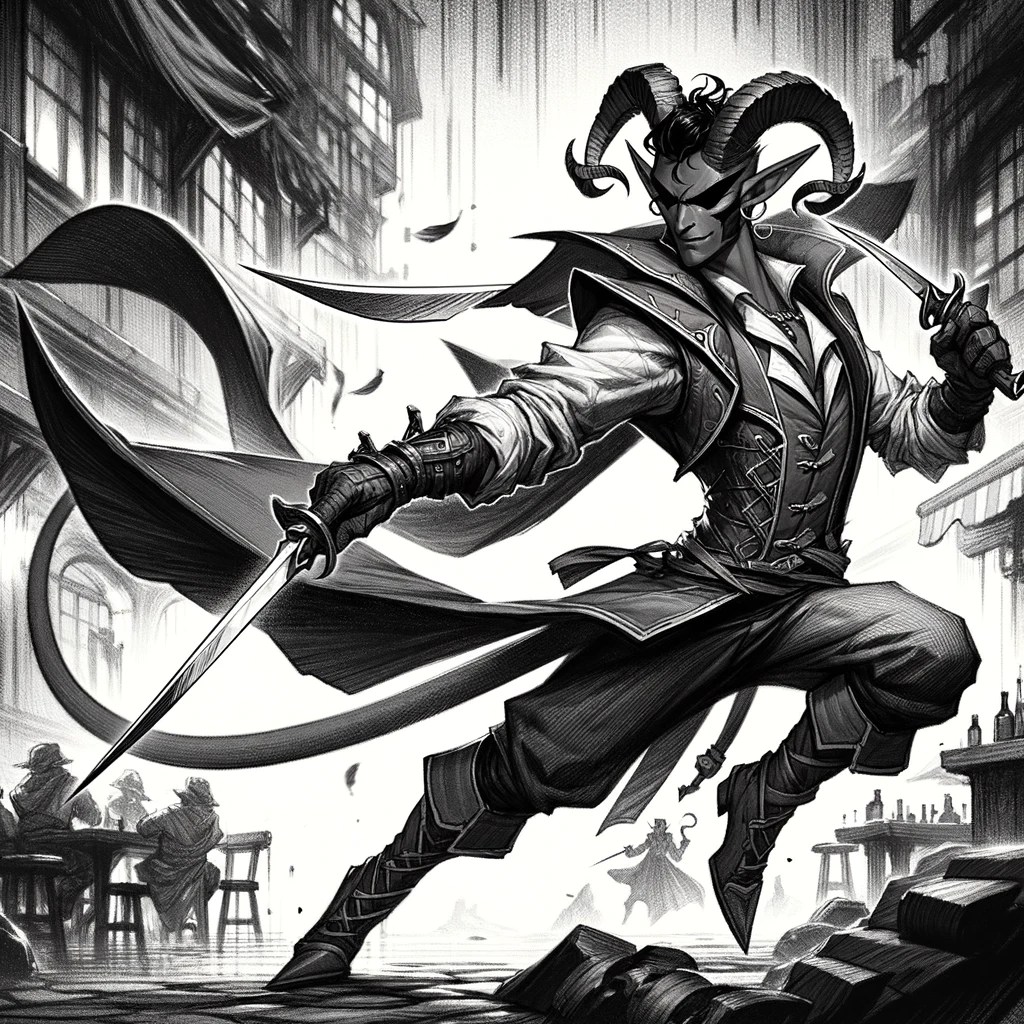 Kirton stands at an average height for a Tiefling, with a lean and agile frame. His skin is a striking shade of purplish-red, accentuated by his sleek, obsidian black horns that curl back from his forehead. His eyes gleam with a mischievous glint, and his tail flicks idly behind him as he moves. Kirton’s attire reflects his dual nature as both entertainer and rogue, often adorned in flashy clothing that allows for swift movement when necessary.